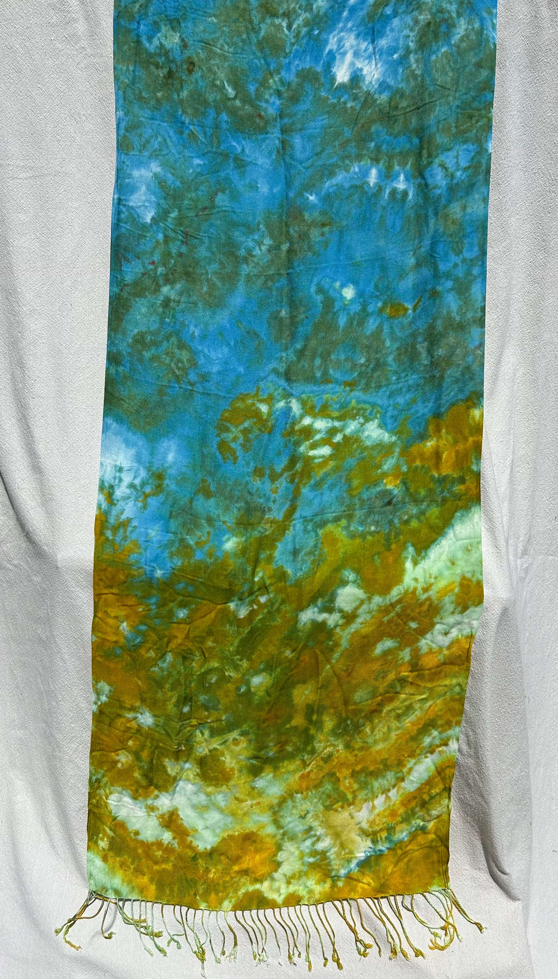 Each scarf is one of a kind, made with care and intention. I begin by finding each one- searching for natural fibers (rayon and cotton blends) at thrift and consignment stores. After washing in a neutral ph soap, I treat the fabric to make the colors permanent. Next, I dye the scarf with richly colored fiber reactive dyes. They sit with the dye on their surface undisturbed for 24 hours (the hardest part!) before rinsing out the loose dye and another wash with unscented detergent in hot water to set the color. After this process, scarves can be washed in laundry on a gentle cycle with similar colored clothes in cold water. (I’ve never had any dye leach out after this initial wash, but better safe than sorry!) Colors will remain vibrant, even after many washes.